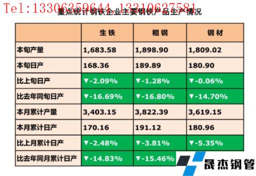 2月24日訊,2月中旬,重點統(tǒng)計鋼鐵企業(yè)共生產粗鋼1898.9萬噸、生鐵1683.58萬噸、精密鋼管1809.02萬噸。其中,粗鋼日產189.89萬噸,環(huán)比下降1.28%;生鐵日產168.36萬噸,環(huán)比下降2.09%;精密鋼管日產180.9萬噸,環(huán)比下降0.06%。精密鋼管庫存量1690.35萬噸,比上一旬增加4.95萬噸,增長0.29%;比去年同期減少64.38萬噸,下降3.67%。